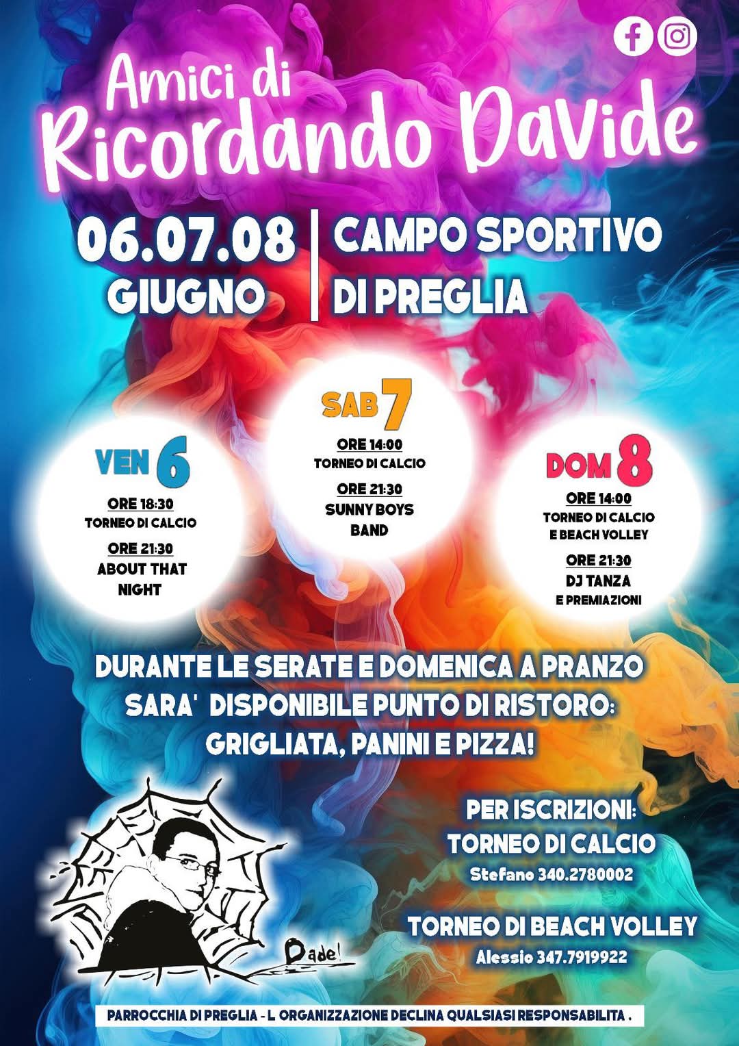 Durante le serate e domenica a pranzo sarà disponibile punto ristoro: grigliata, panini e pizza.