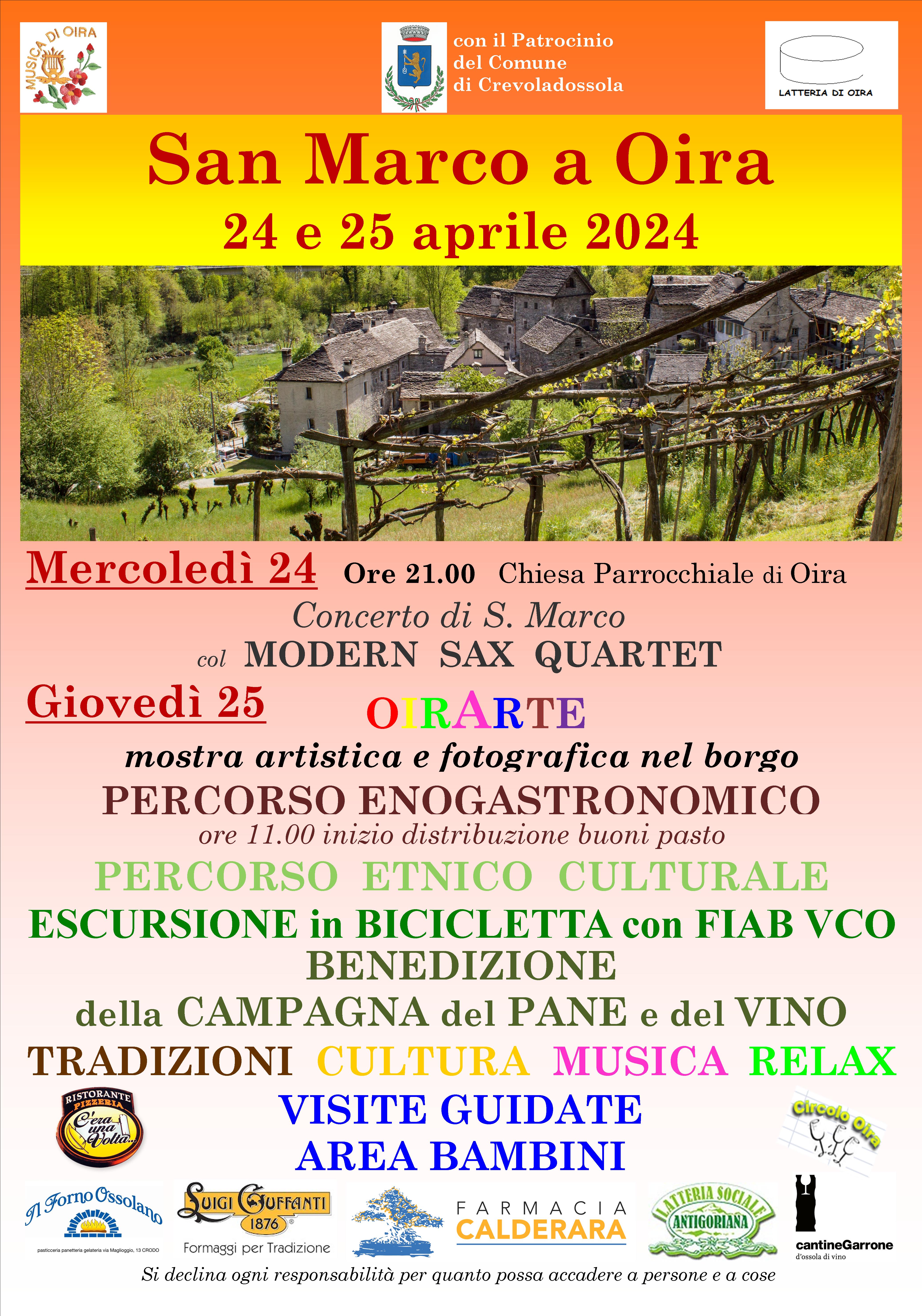 La Musica di Oira e l'Associazione Latteria di Oira, con il patrocinio del Comune di Crevoladossola organizzano la tradizionale Festa di San Marco a Oira.
