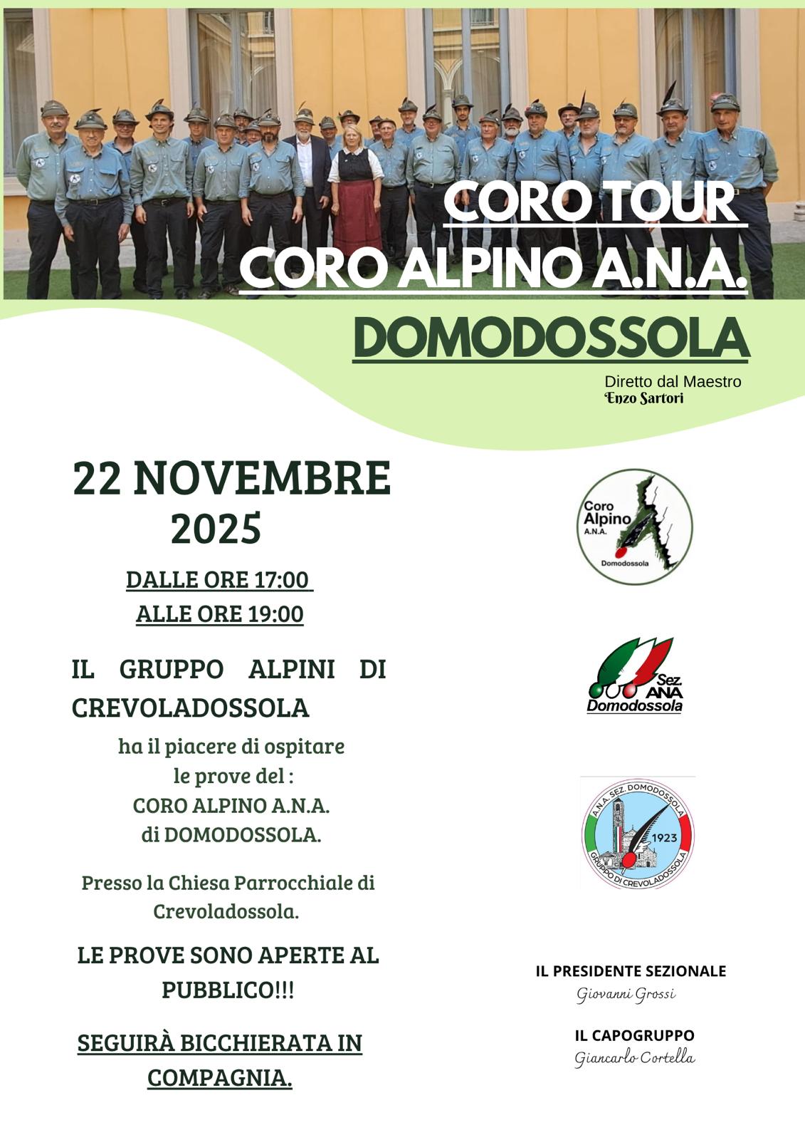 Il Gruppo Alpini di Crevoladossola ha il piacere di ospitare le prove del Coro Alpino A.N.A. di Domodossola Diretto dal Maestro Enzo Sartori dalle ore 17.00 alle ore 19.00 presso la Chiesa Parrocchiale di Crevoladossola.