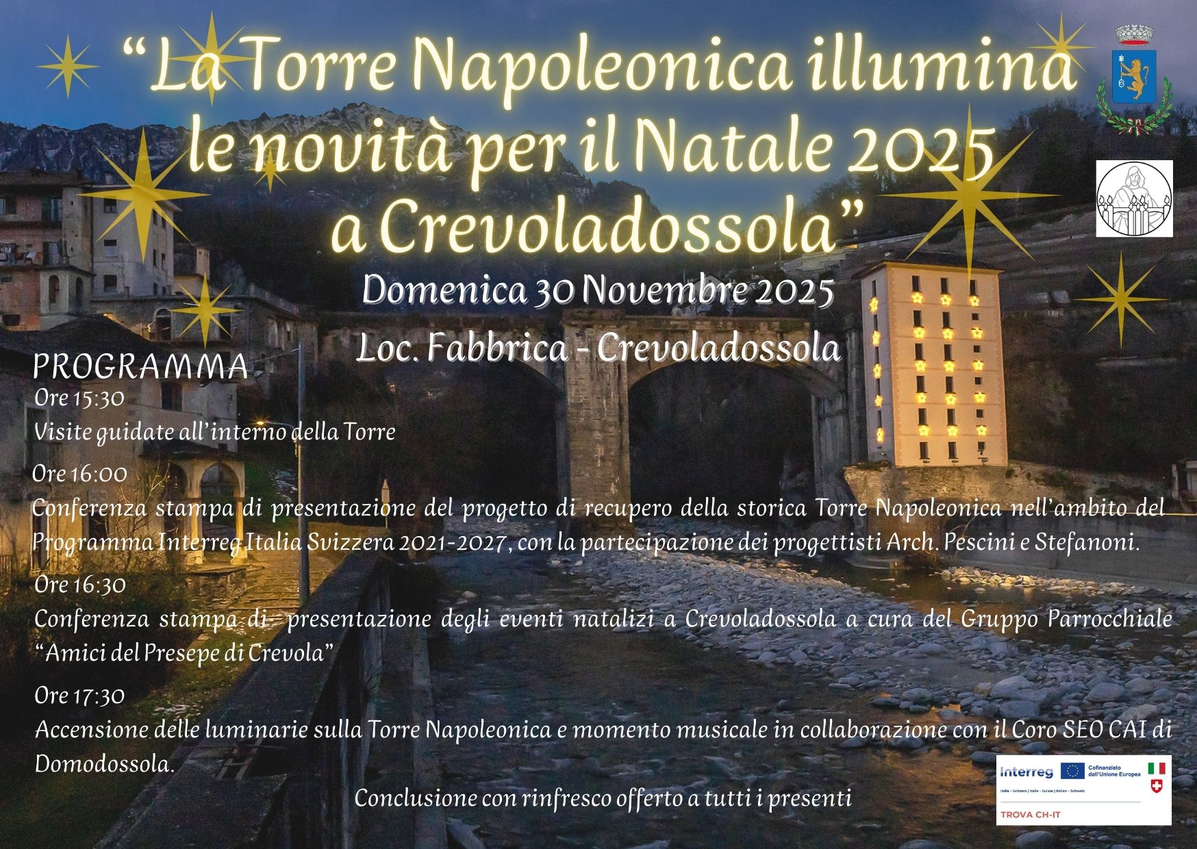 Accensione delle luminarie sulla Torre Napoleonica e momento musicale in collaborazione con il Coro SEO CAI di Domodossola