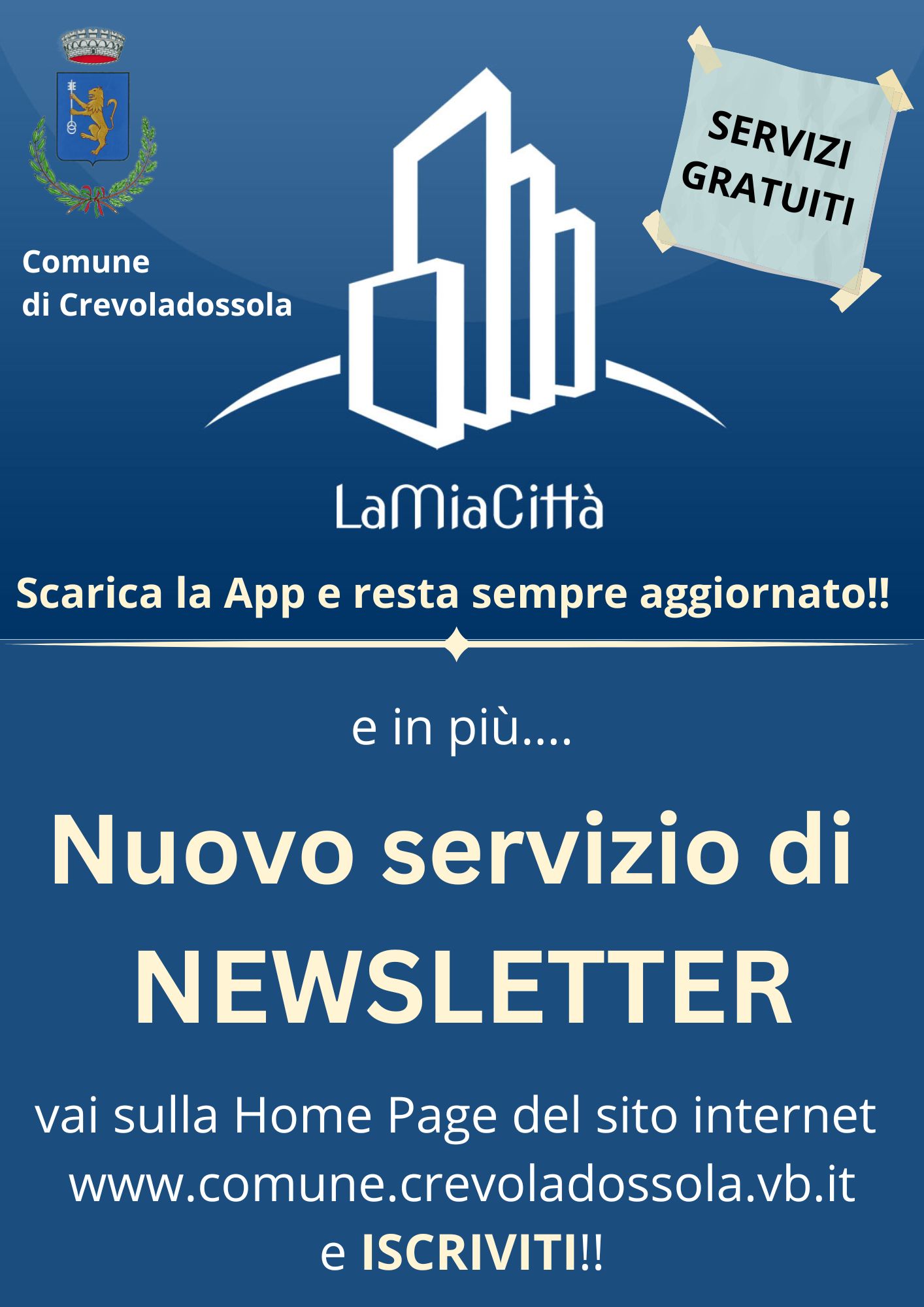 Con piacere siamo a comunicare a tutti i nostri cittadini che da oggi sono attivi il servizio di Newsletter e la App "la Mia Città" del Comune di Crevoladossola, per restare sempre informati e aggiornati con le notizie, gli avvisi, le attività e gli eventi che riguardano il nostro Comune.