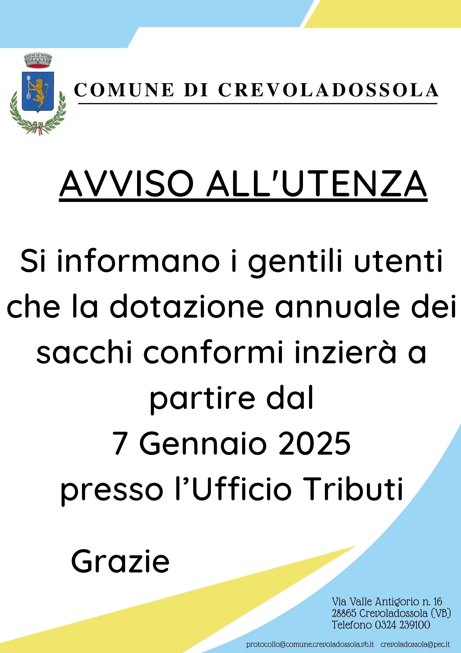 Si informano i gentili utenti che la dotazione annuale dei sacchi conformi inizierà a partire dal 7 gennaio 2025 presso l'Ufficio Tributi.