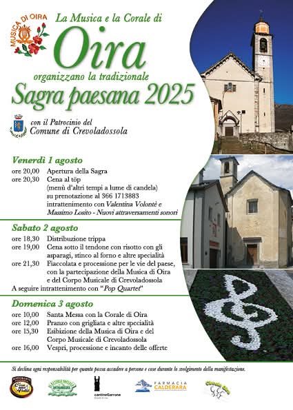 a cura della Parrocchia e della Musica di Oira con il patrocinio del Comune di Crevoladossola