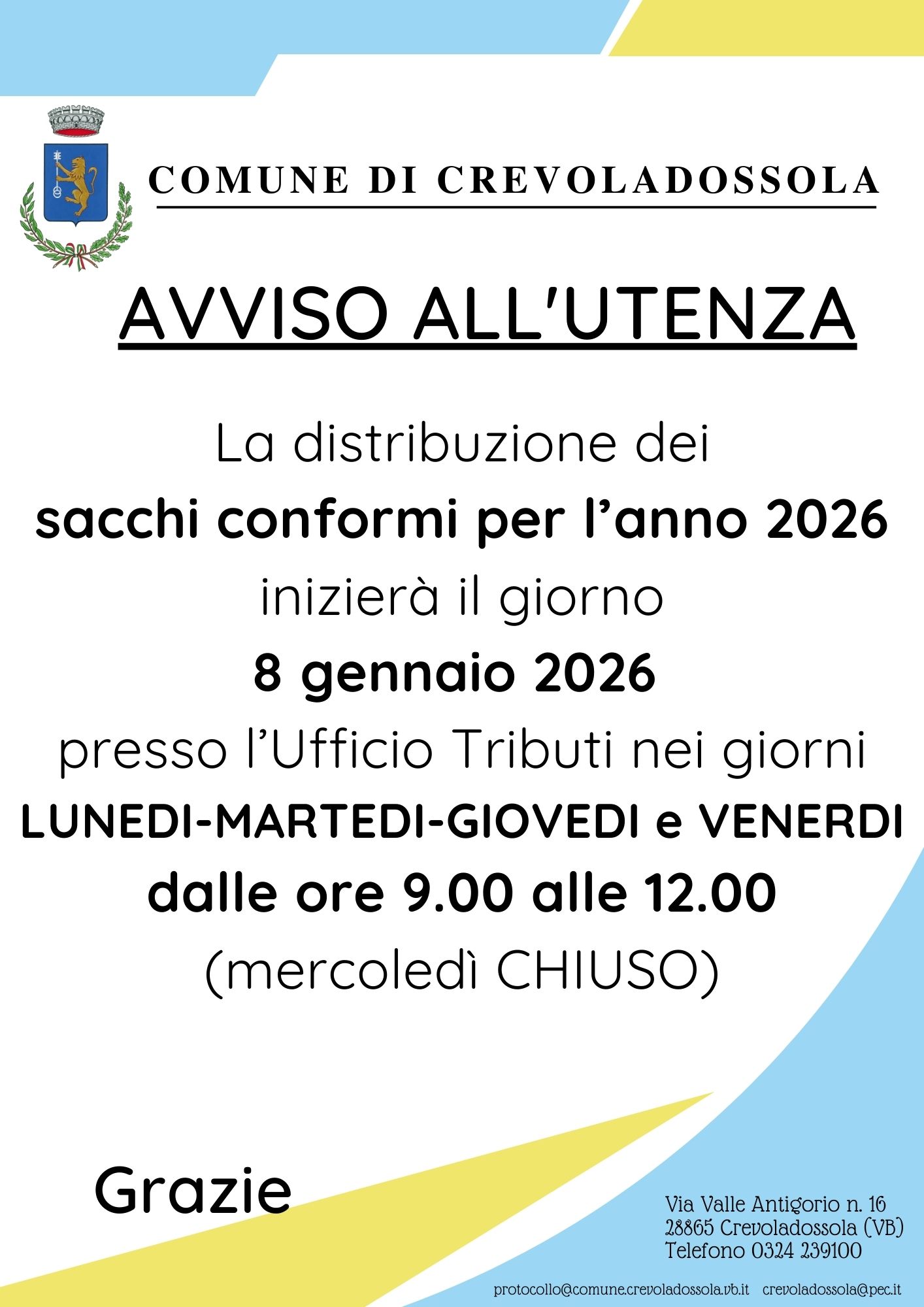 La distribuzione dei sacchi conformi per l'anno 2026 inizierà il giorno 8 gennaio 2026 presso l'Ufficio Tributi nei giorni lunedì, martedì, giovedì e venerdì dalle ore 9.00 alle 12.00 (Mercoledì CHIUSO)